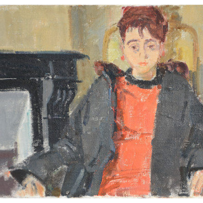 Annette Bäschlin in rotem Kleid, sitzend, 1966