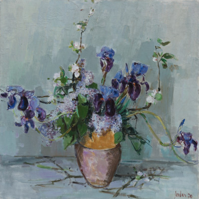 Stillleben mit Vase mit Schwertlilien, Flieder und Blütenzweig, 1970