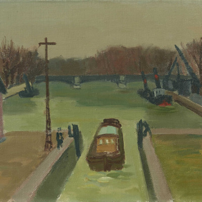 Schleuse mit Brücke im Hintergrund