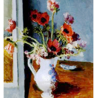 Vase mit Tulpen und Margeriten