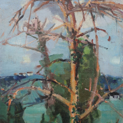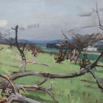 Landschaft mit kahlem Baum im Vordergrund. Öl auf Leinwand, links unten signiert: Zender. 54 x 31