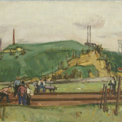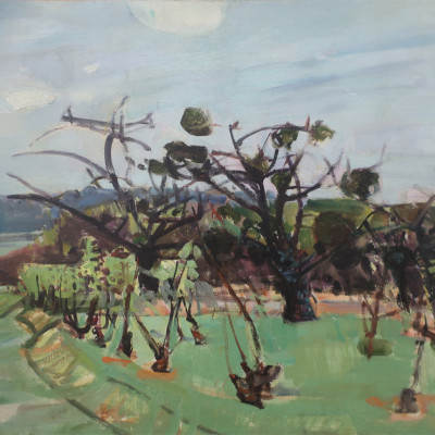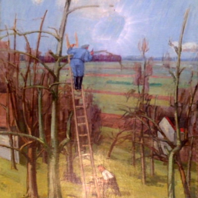 Spätherbst im Obstgarten/Baumschnitt im Spätherbst, 1942. Öl auf Leinwand, rechts unten signiert und datiert: Zender 42. Montiert im grossen Saal des Hombergerhauses (früher GF-Haus) in Schaffhausen