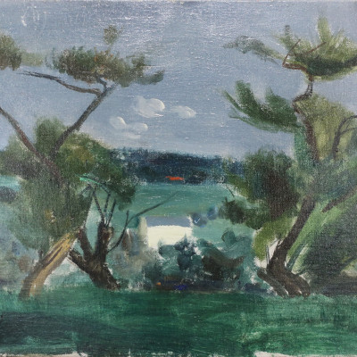 Landschaft mit weissem Haus. Öl auf Leinwand, links unten signiert: Zender. 33 x 46