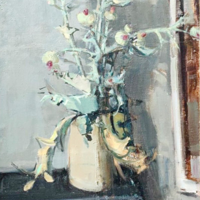Stillleben mit Artischocke, Wein und Margeritenstrauss